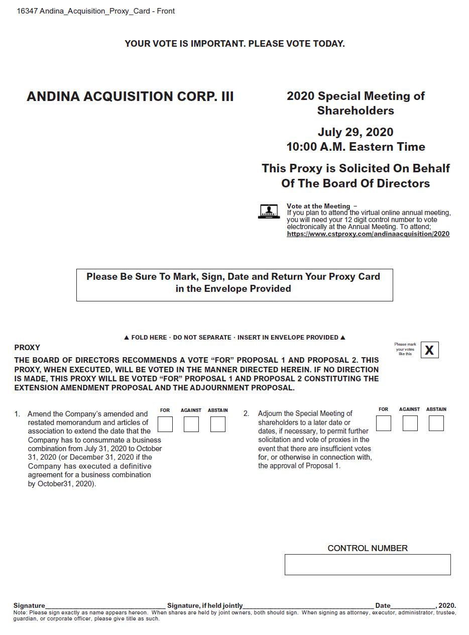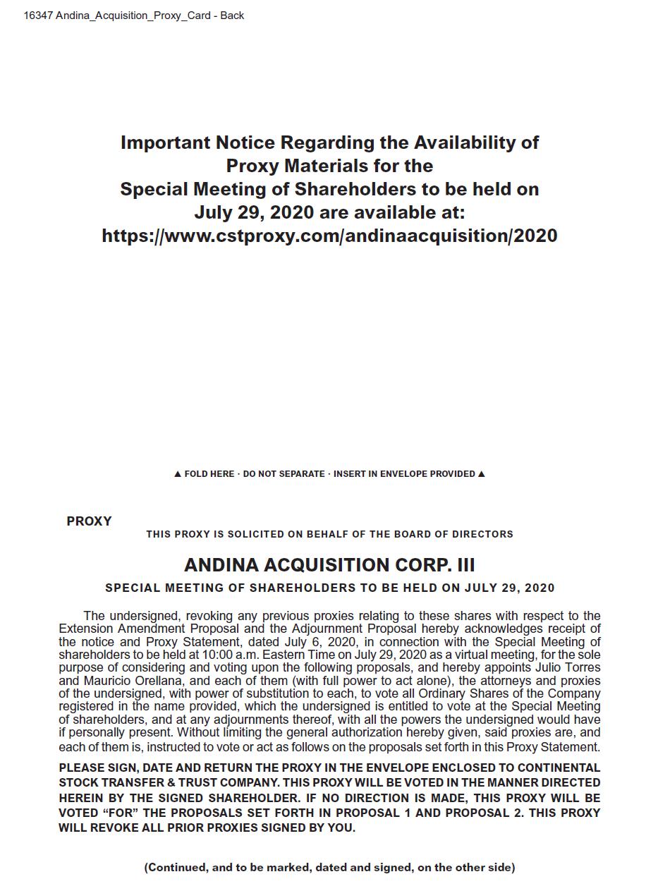 You are cordially invited to attend the extraordinary general meeting, which we refer to as the “Special Meeting”, of shareholders of Andina Acquisition Corp. III, which we refer to as “we”, “us”, “our”, “Andina” or the “Company”, to be held at 10:00 a.m. Eastern Daylight Time on July 29, 2020. The formal meeting notice and proxy statement for the Special Meeting are attached.