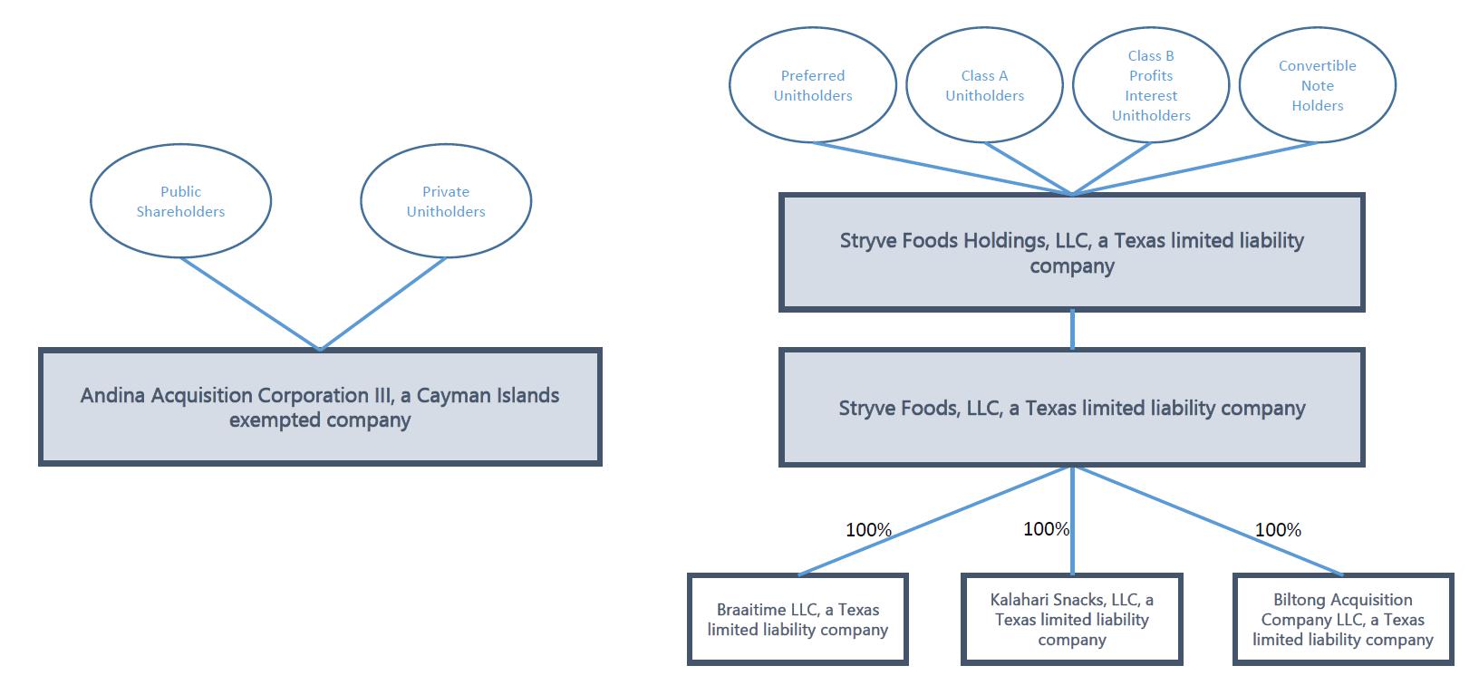 It is proposed that, upon the effectiveness of the Business Combination, Andina will change its name to “Stryve Foods, Inc.” and the combined company will be organized in an umbrella partnership–C corporation structure, in which substantially all of the assets of the combined company will be held by Holdings, and Andina’s only assets will be its equity interests in Holdings. “Stryve Foods, Inc.” and Andina, following the Business Combination, are both referred to herein as the “Company.”